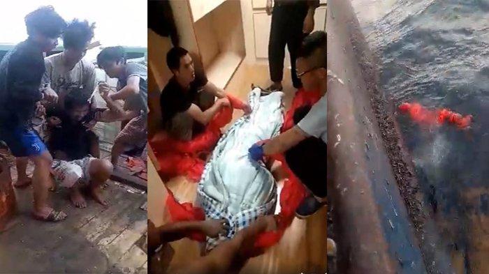 Sebelum dibuang ke laut, mayat yang berada di dalam selimut tampak diangkat oleh tiga orang yang mengenakan baju hitam.