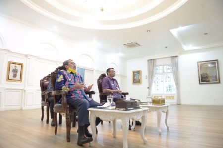 PEKANBARU, MitraNews.co – Gubernur Riau Syamsuar mengikuti Video Conference Government Roundtable Series Covid-19. “Riau, Paska Minyak Bumi dan Sawit” di kediaman Gubernur Riau, Kamis (23/7/2020).