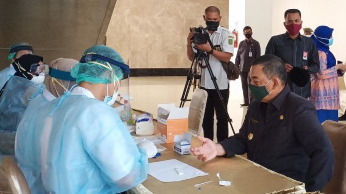 PEKANBARU, MitraNews.co – Gubernur Riau (Gubri) H Syamsuar pantau rapid test sebelum digelarnya prosesi pelantikan pejabat eselon II lingkungan Pemerintah Provinsi Riau yang gelar di Dang Merdu Bank Riaukepri.