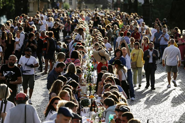 Di jembatan abad ke-14, warga Praha mengunyah makanan ringan dan menyeruput minuman yang mereka bawa dari rumah, berbagi makanan dengan yang lain di meja sepanjang 500 meter.