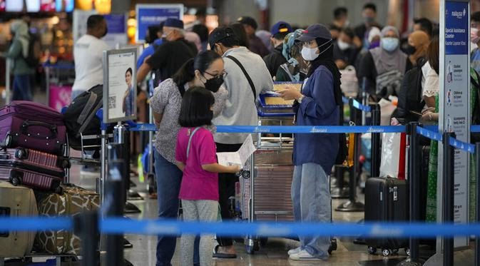 Pelancong mengantre di konter check-in Bandara Internasional Kuala Lumpur, Sepang, Malaysia, Jumat (1/4/2022). Mulai hari ini, Malaysia membuka perbatasannya untuk orang asing dan pelancong yang sudah divaksin COVID-19 lengkap tanpa harus menjalani karantina. (AP Photo/Vincent Thian)