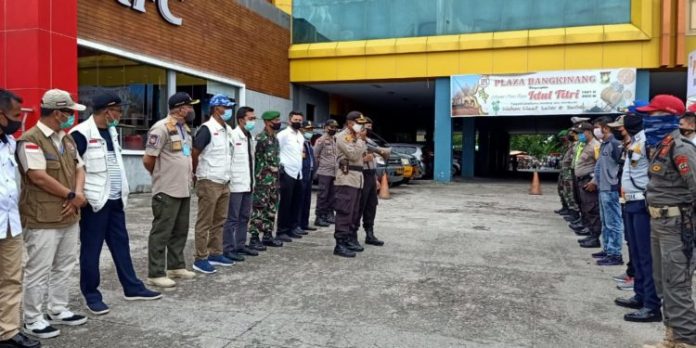 Selanjutnya petugas gabungan melaksanakan kegiatan pendisiplinan masyarakat dengan melakukan pemeriksaan di depan Gerbang Utama Plaza Bangkinang, dengan melakukan pengecekan suhu tubuh dan menganjurkan untuk memakai masker kepada setiap masyarakat yang memasuki kawasan Plaza Bangkinang.