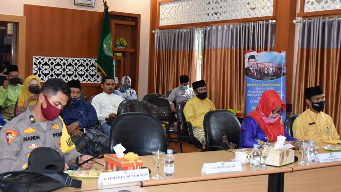 Tampak hadir mengikuti telekonferemsi tersebut Kapolres Bengkalis diwakili Kasi Ops Kompol irnanda Oktaria, Inspektur Bengkalis Rafiardi Ikhsan, Sekretaris Dinsos Bengkalis Reza Noverindra dan staf Diskominfotik Bengkalis Andri Irawan.
