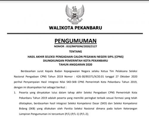 Nama-nama peserta yang lulus CPNS Tahun 2019 Kota Pekanbaru bisa dilihat dengan KLIK DISINI.