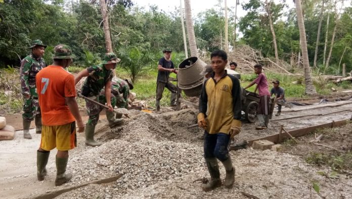 BENGKALIS, MitraNews.co – Memasuki hari ke- 8 TMMD ke-108 tahun 2020 di wilayah Kodim 0303/ Bengkalis hari ini kembali melanjutkan pengecoran jalan, di gang Kadiran Desa Temiang Kecamatan Bandar Laksamana, Kabupaten Bengkalis, Selasa (07/07/20).