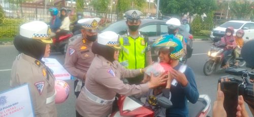 “Bagi pengendara yang tertib menggunakan helm dan safety belt kami berikan souvernir,” kata Birgita.