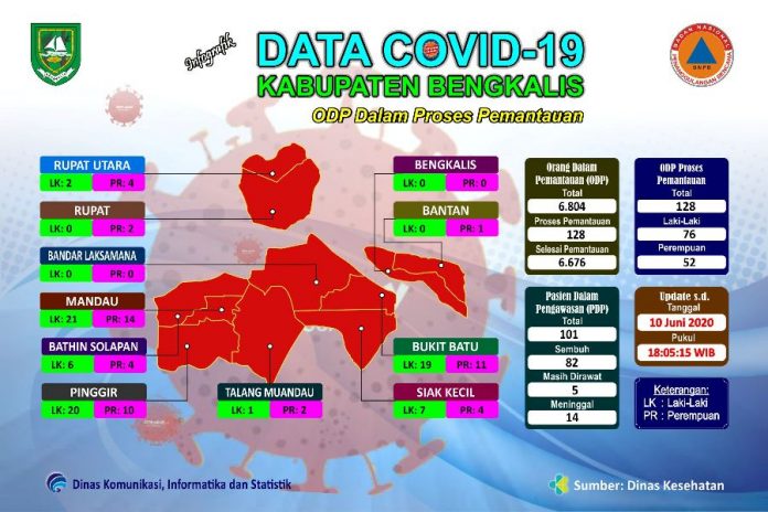 Kadis Kominfotik yang juga Juru Bicara Gugus Tugas Percepatan Penanganan Covid-19 Kabupaten Bengkalis Johansyah Syafri mengatakan, ODP di Kabupaten Bengkalis, per 10 Juni 2020, sebanyak 128 orang.