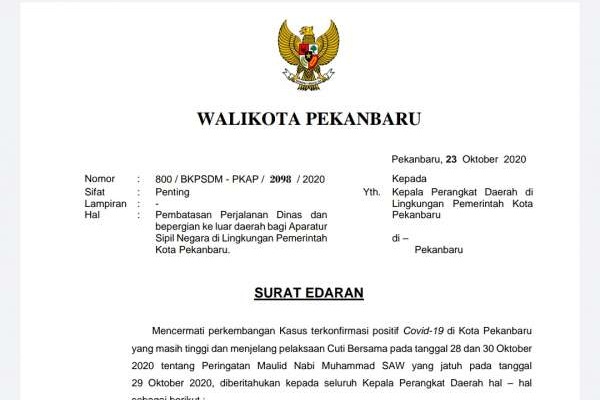 PEKANBARU, MitraNews.co – Wali kota Pekanbaru, Firdaus menandatangani surat edaran Nomor 800/BKPSDM – PKAP/2098/2020, Jumat (23/10/2020). Surat itu berisi tentang pembatasan perjalanan dinas dan bepergian ke luar daerah bagi Aparatur Sipil Negara (ASN).